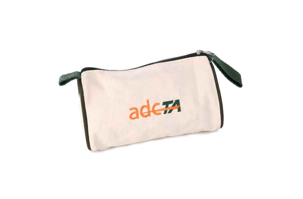 Necessaire produzida em algodão cru com alça de mão, fechamento com zíper, acabamento com viés, medidas 23 x 14 x 8 cm. Gravação serigrafia em 1 cor.