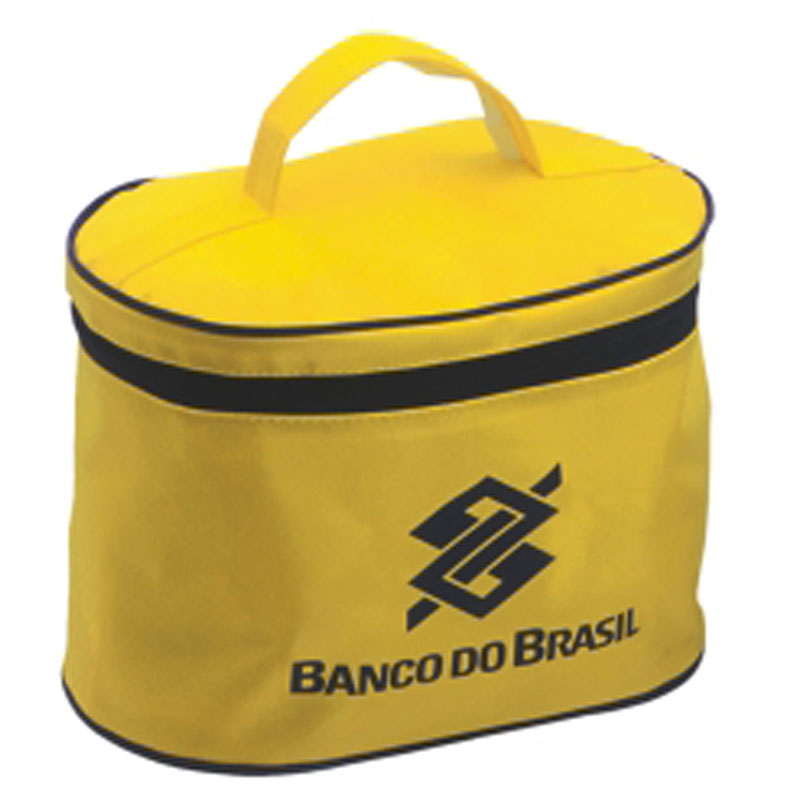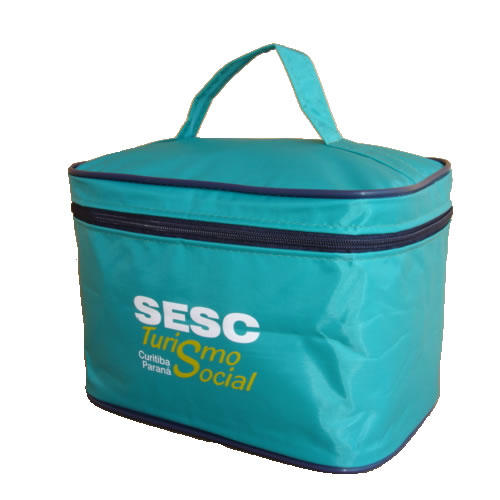 Nécessaire em poliéster 600 com alça de mão vivo e zíper, medidas 22 x 14 x 12 cm. Gravação serigrafia em 1 cor.