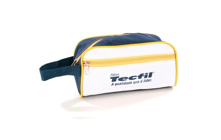 Necessaire produzida em poliéster com bolso frontal e central, acabamento com vivo, viés e zíper. Medidas 21 x 11 x 9 cm (LxAxP). Gravação serigrafia em 1 cor.