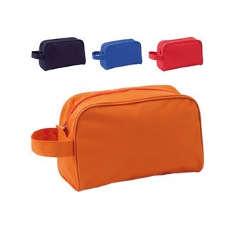 Necessaire em Poliéster 600 com alca de mão, fechamento com zíper, medidas 21 x 16 x 10cm . Gravação serigrafia em 1 cor.