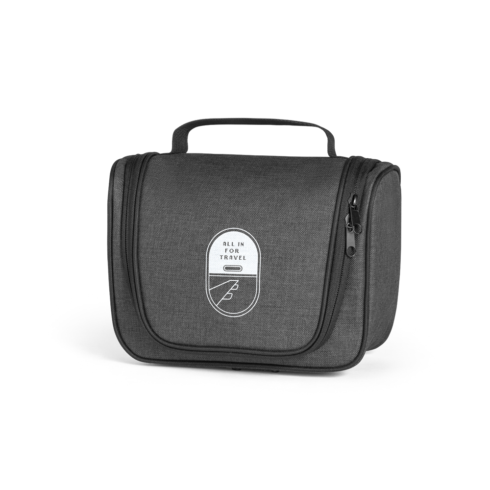 Nécessaire produzida em poliéster 600D de alta densidade, possui vários bolsos interiores e gancho de pendurar, medidas 250 x 180 x 105 mm. Gravação serigrafia em 1 cor.