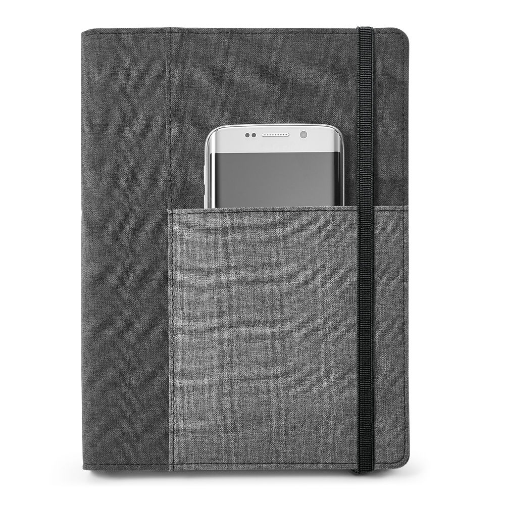 Paste executiva com capa em poliéster e bloco de anotações na parte interna removível com 80 folhas não pautadas, possui bolso interior, porta caneta e bolso externo, medidas 16 x 22 cm. Gravação serigrafia em 1 cor.
