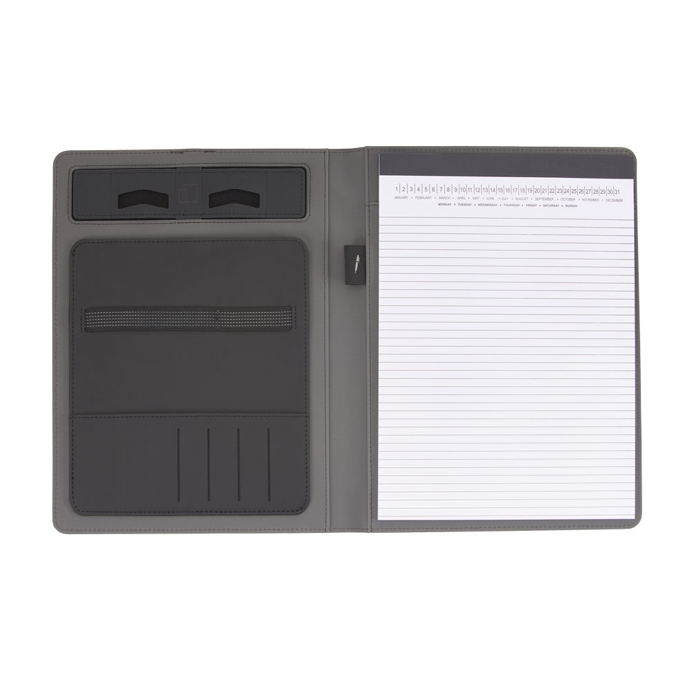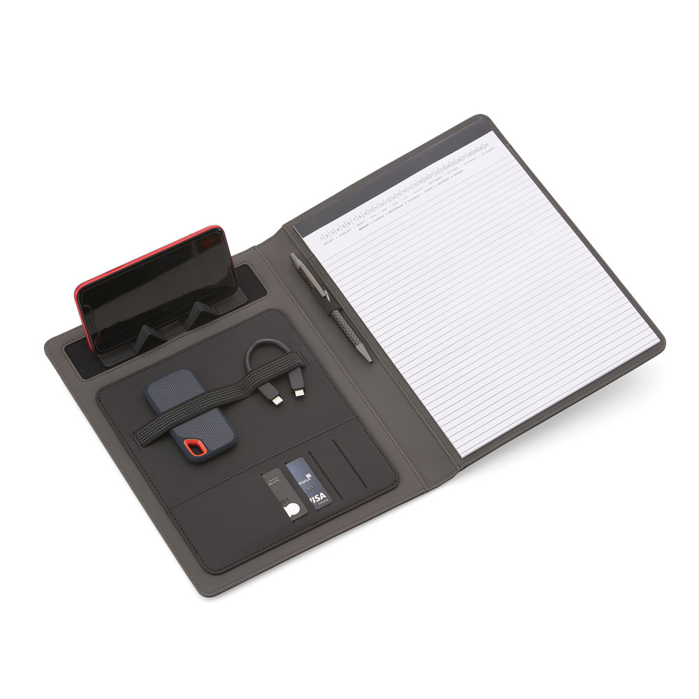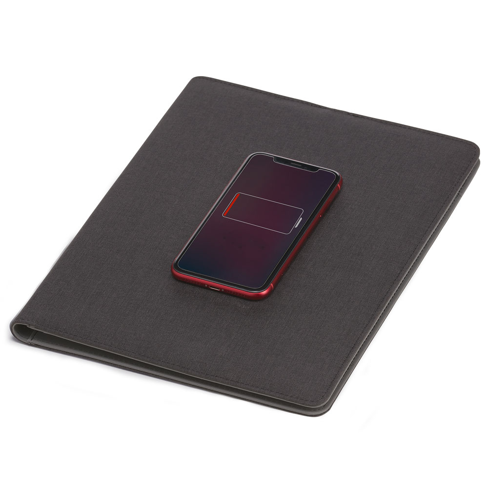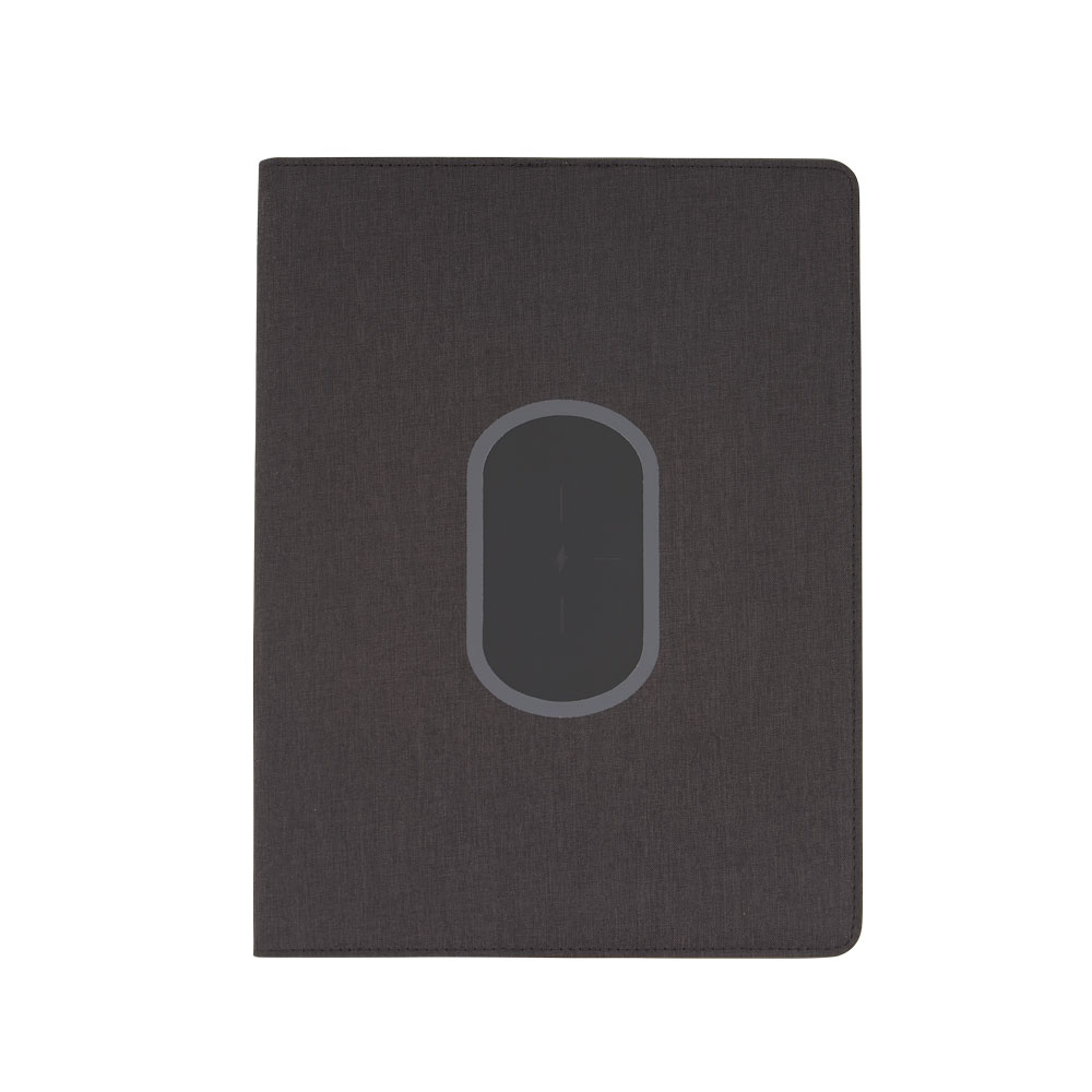 Pasta convenção com carregador por indução. Capa confeccionada em poliéster, possui indutor de carga na capa (para usufruir do do carregador é necessário que o tablet ou smartphone tenha a tecnologia QI), parte interna com suporte para tablet e/ou celular, bolso para documentos, duas fitas elásticas, bolso com divisórias para cartões, suporte elástico para caneta, bloco de anotações com aproximadamente 20 folhas brancas pautadas. Possui entrada micro USB na parte superior do bloco, necessário para conexão do cabo para receptar a energia. Acompanha cabo USB. Obs.: Este produto não possui bateria, é apenas um receptor de carga. Para utilização é necessário conectar à uma bateria externa. Gravação serigrafia em 1 cor.