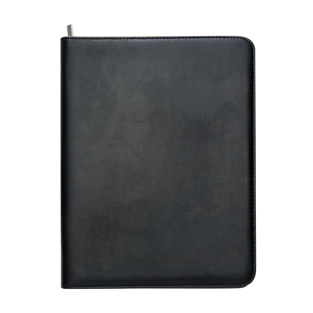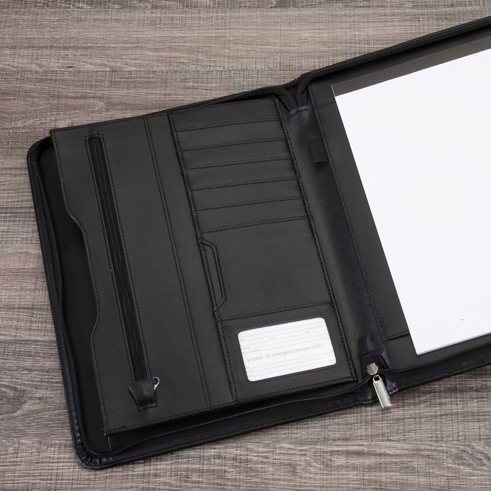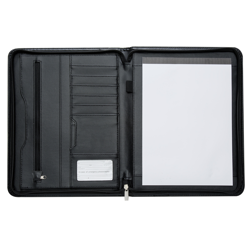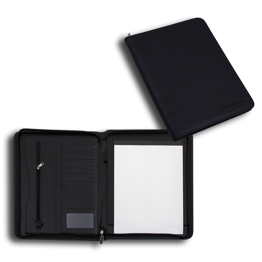 Pasta convenção de couro sintético com zíper, possui 2 compartimentos grandes para arquivar documentos, compartimento interno com zíper, 7 divisórias pequenas para documentos, suporte com visor para cartão de identificação, suporte para caneta(não acompanha caneta) e bloco com 20 folhas pautadas, medidas 33,8 cm x 25,0 cm. Gravação baixo relevo.