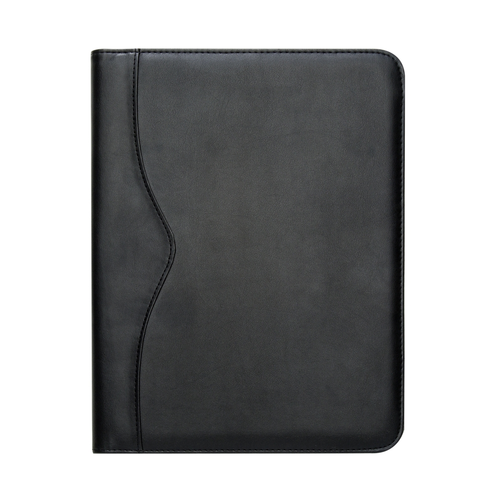 Pasta convenção de couro sintético, possui calculadora solar plástica de 8 dígitos, suporte para cartão, suporte com visor para cartão de identificação, suporte para arquivar documentos, suporte para caneta(não acompanha caneta) e bloco com 20 folhas pautadas, medidas 31,5 cm x 24,1 cm. Gravação baixo relevo.