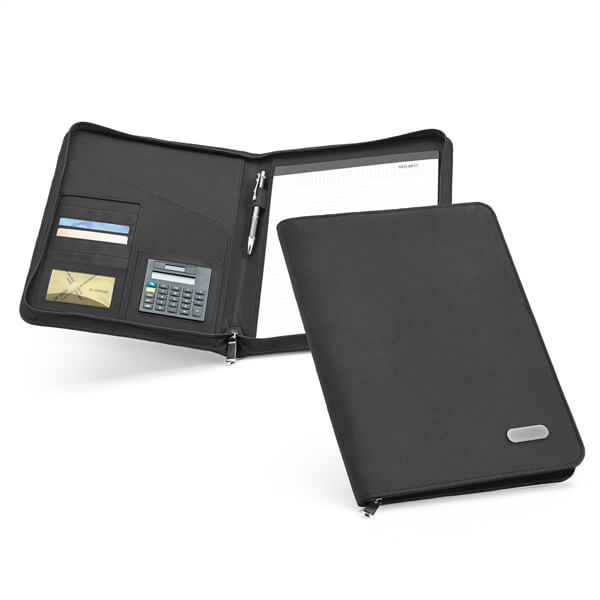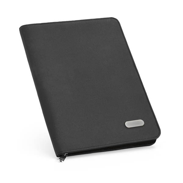 Pasta executiva tamanho A4 produzida em microfibra com calculadora dual-power de 8 incluso pilha LR1130, bloco com 20 folhas pautadas, medidas 245 x 340 x 40 mm . Gravação a laser em placa de metal.