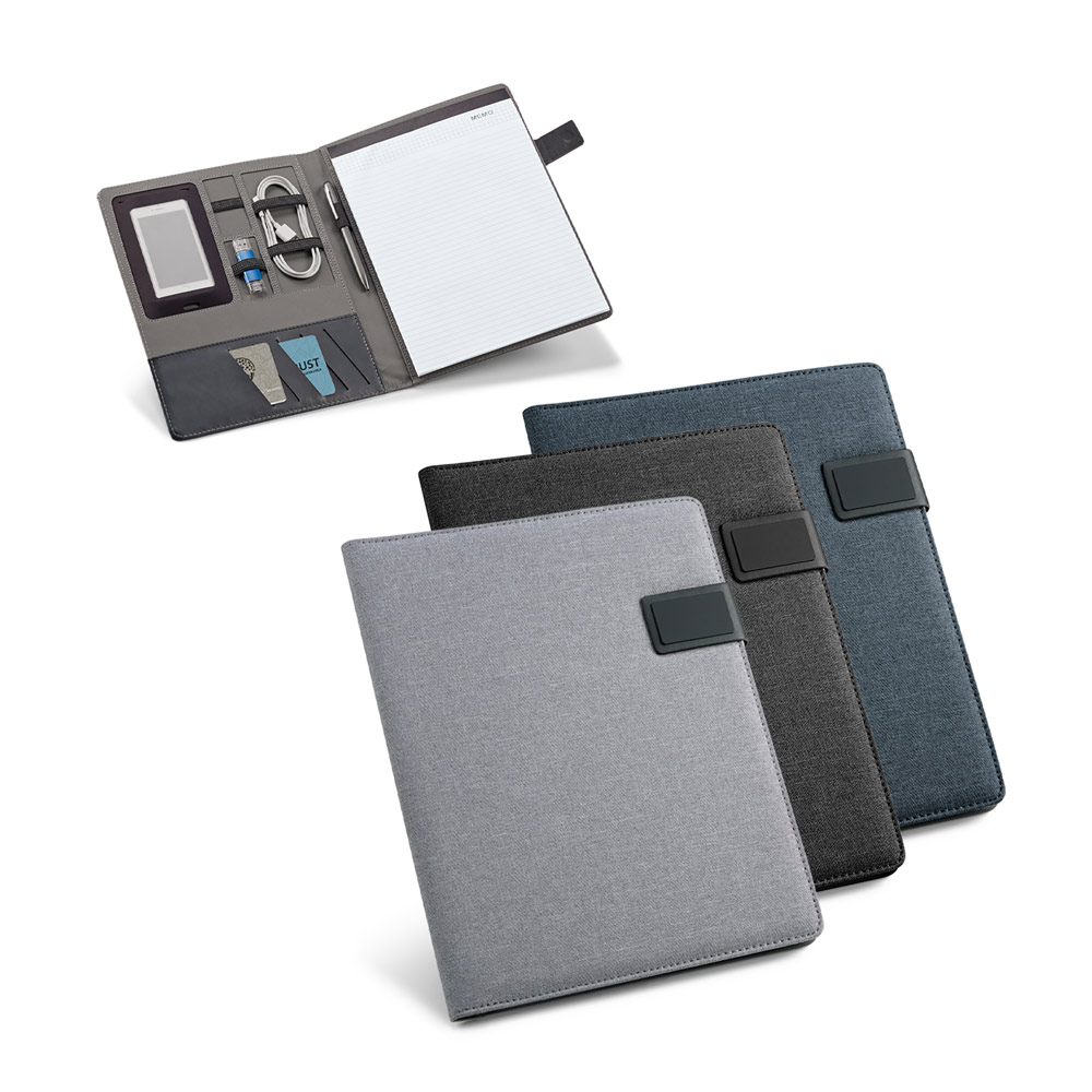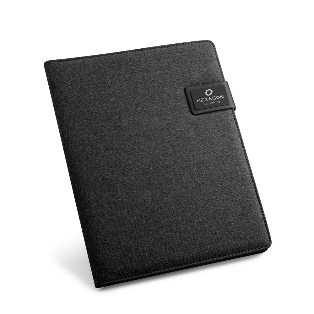 Pasta tamanho A4, produzida em sintético e 800D poliéster, possui interior em microfibra e bloco com 20 folhas pautadas, medidas 245 x 315 x 15 mm. Gravação a laser.
