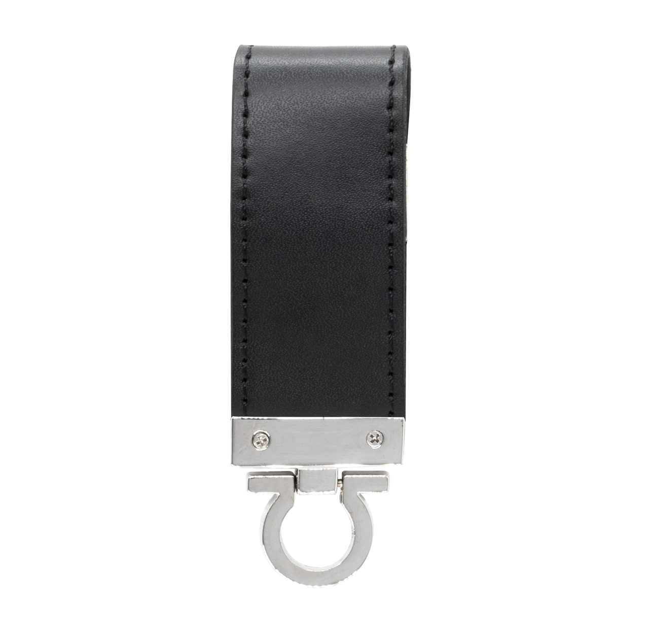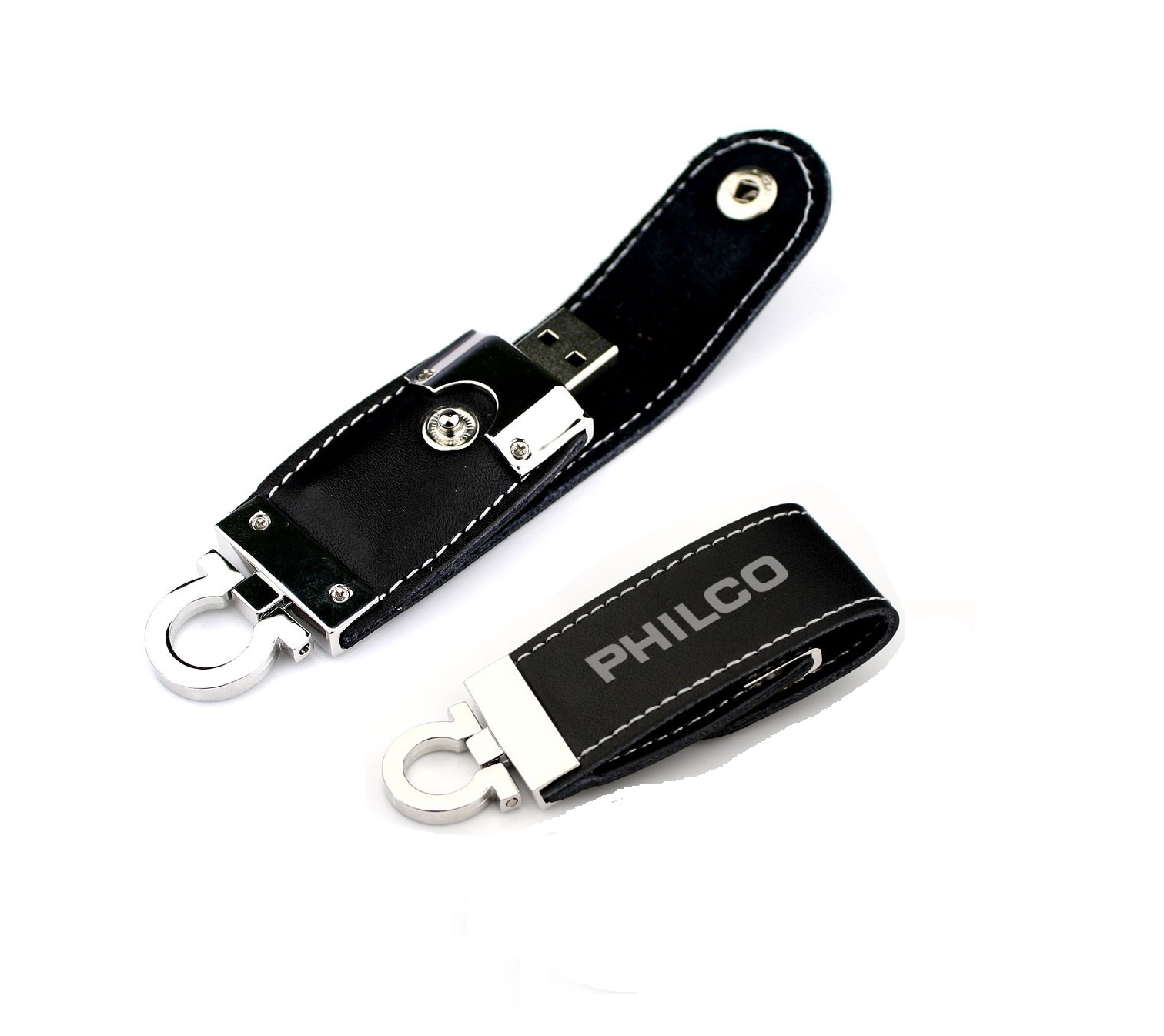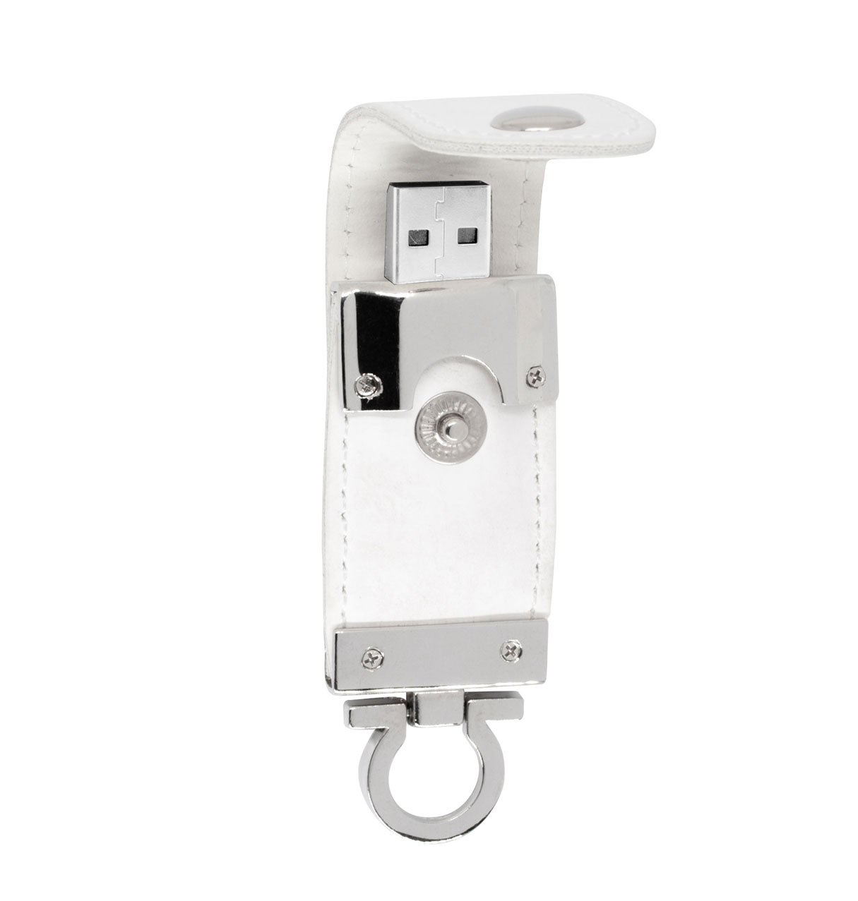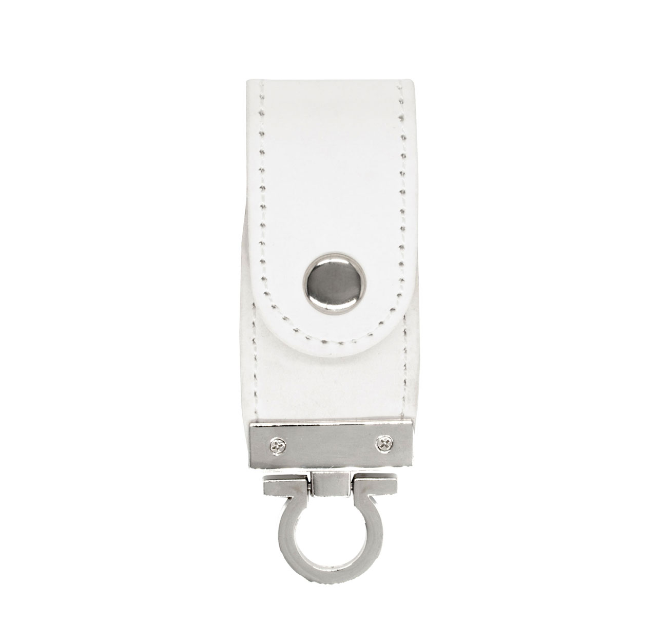 Pen drive em sintético com costura, possui botão e detalhes prata(verso liso). Parte inferior possui “argola” para utilizar como chaveiro, medidas Altura : 8,7 cm x Largura : 2,9 cm. Gravação a laser.
