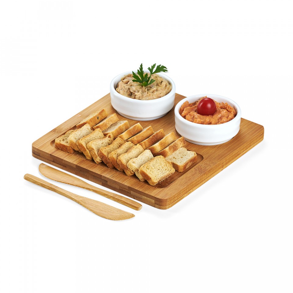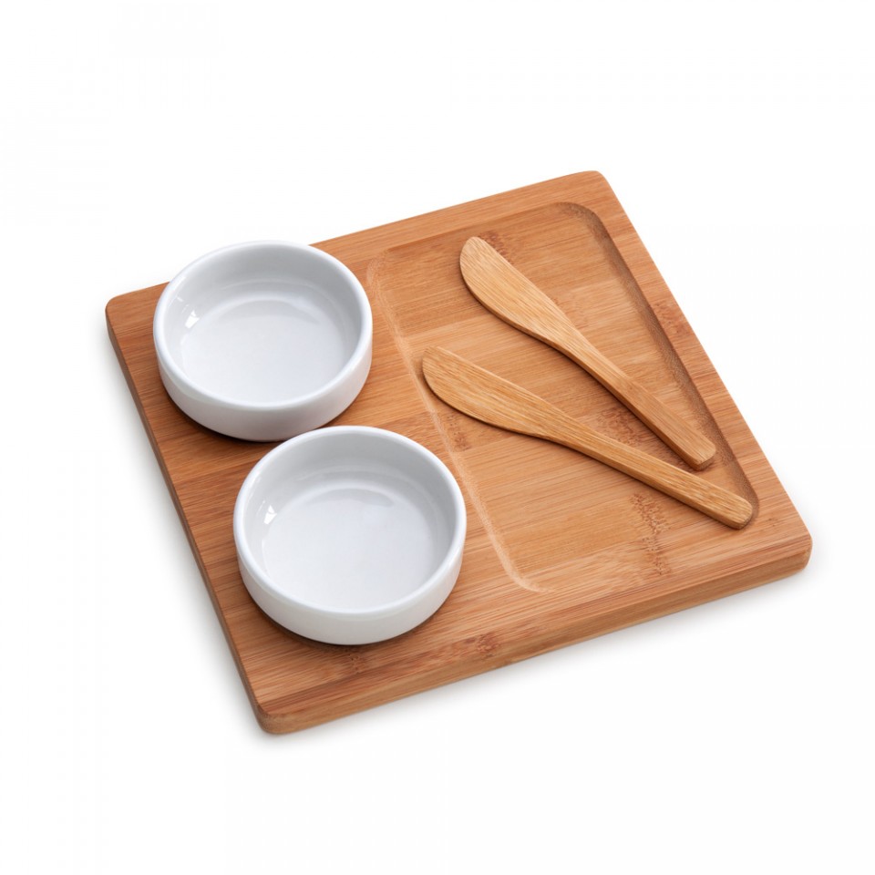 Petisqueira em bambu com 02 potes de cerâmica e 02 espátulas em bambu. Gravação a laser.