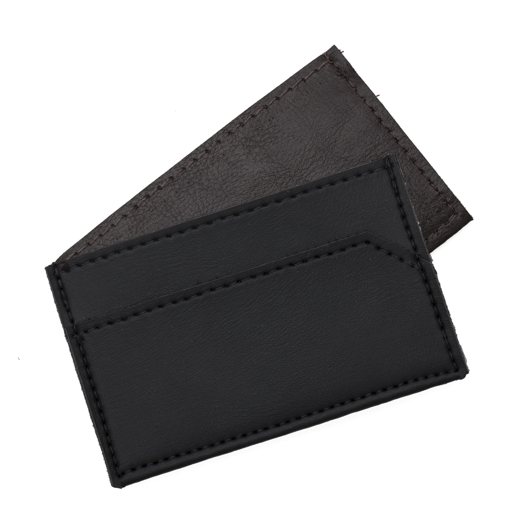 Porta cartão simples em couro sintético com duas divisórias, medidas 11×7 cm. Gravação baixo relevo.