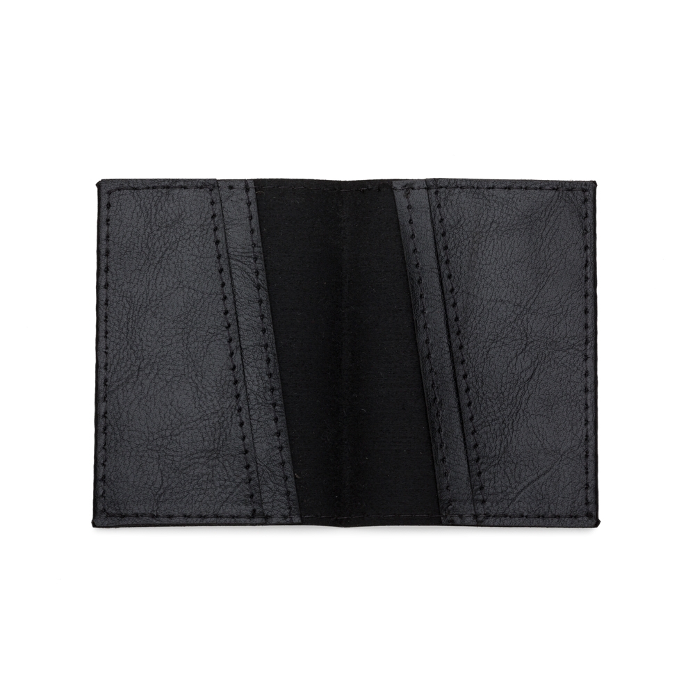 Porta cartão em couro sintético com quatro divisórias em diagonal, medidas 7,5 cm x 10,4 cm. Gravação baixo relevo.