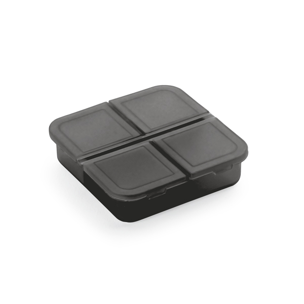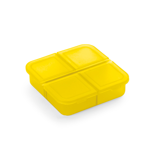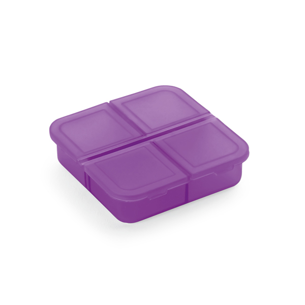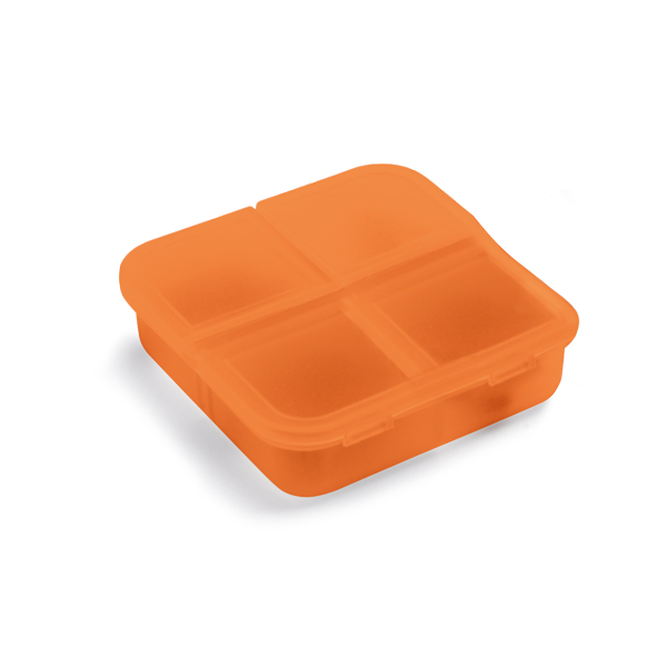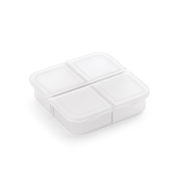 Porta comprimidos plástico com 4 divisórias, medidas 60 x 60 x 18 mm. Gravação serigrafia em 1 cor.