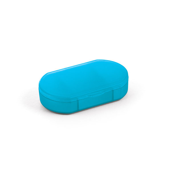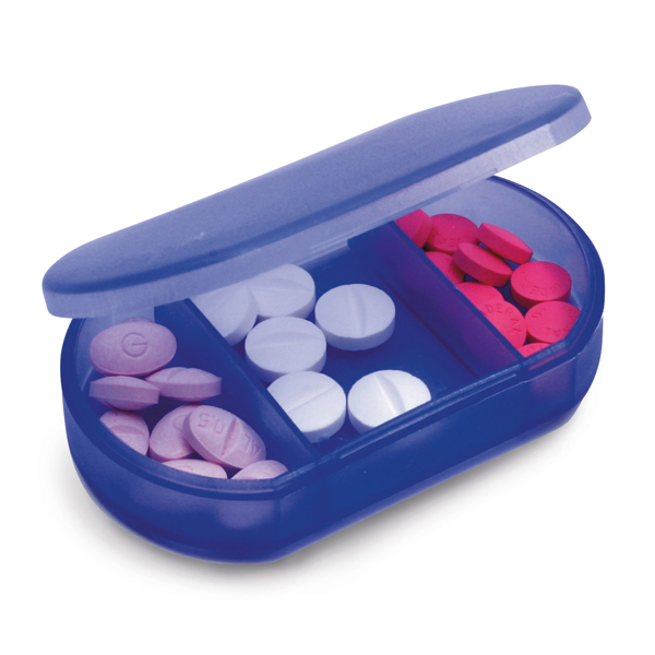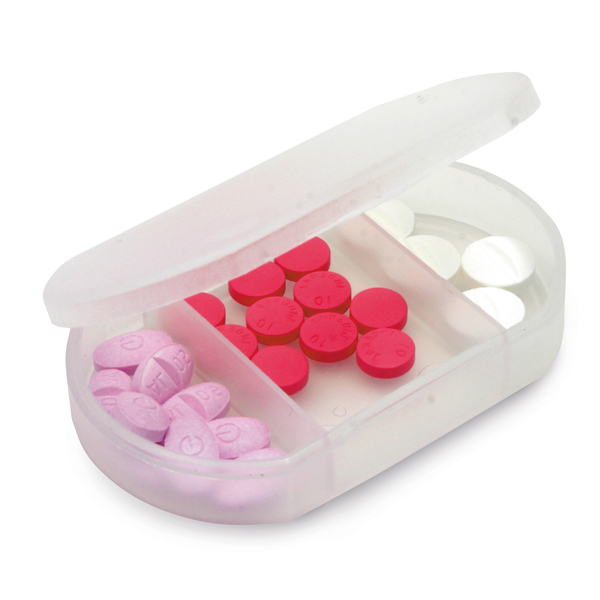 Porta comprimidos plástico,possui 3 divisórias, medidas 60 x 35 x 13 mm. Gravação serigrafia em 1 cor.