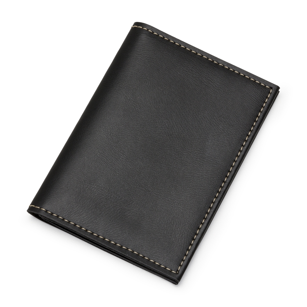 Porta documento em couro sintético, parte interna revestida de veludo e dois “bolsos” com visor plástico.Medidas aproximadas 12,8 cm x 9,2 cm. Gravação baixo relevo.