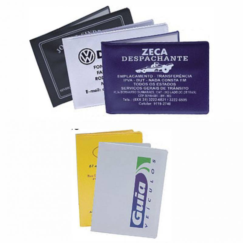 Porta documento veicular produzido em PVC leitoso, e na parte interna visor de pvc transparente, medidas 11,6 x 8,8 cm. Gravação serigrafia em 1 cor.