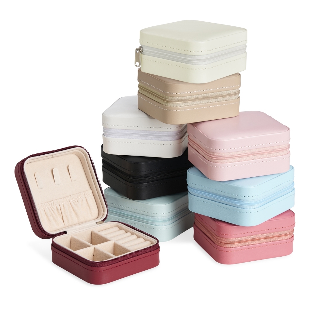 Porta joias de couro sintético com revestimento aveludado. Possui compartimentos internos para anéis, brincos, pulseiras e colares.