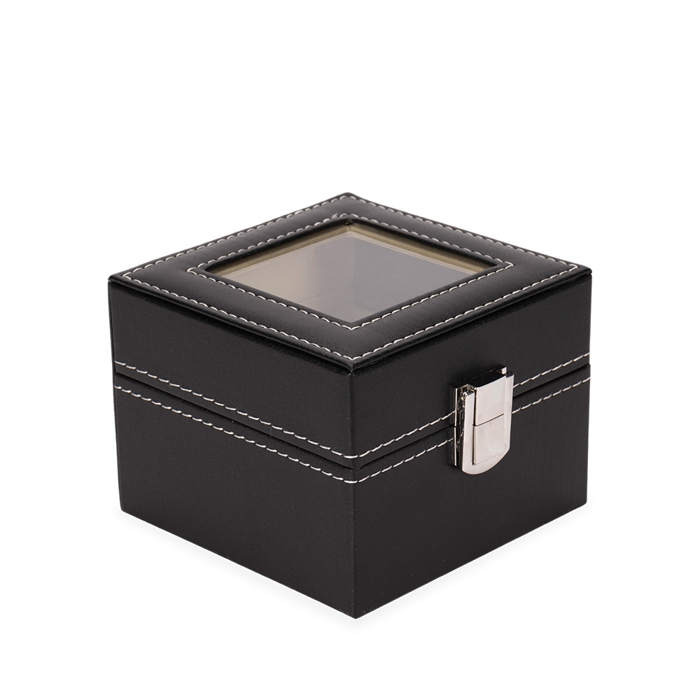 Descrição: Porta-relógios com acabamento em couro sintético à base de PVC. Com revestimento interno de veludo, possui duas divisórias com almofadas removíveis, tampa com visor de vidro e trava de segurança para o fechamento do estojo.