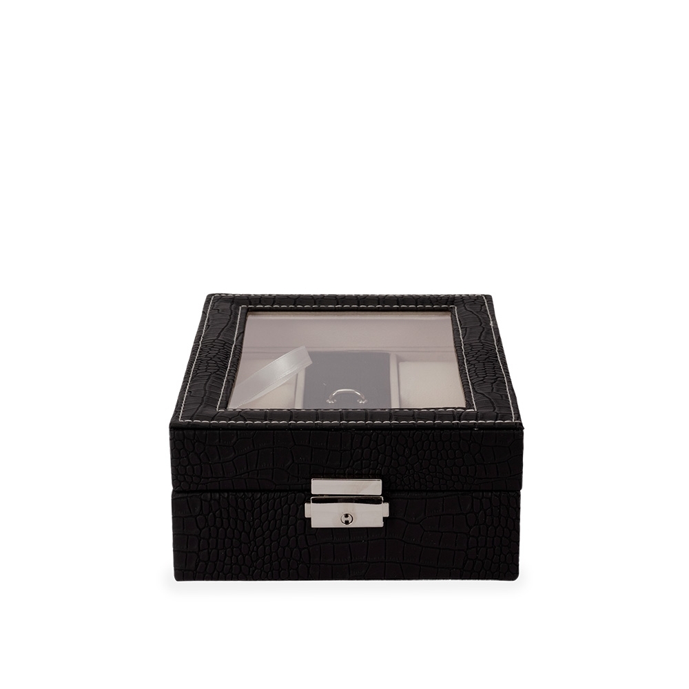 Descrição: Porta-relógios com acabamento em couro sintético. Conta com revestimento interno em veludo e seis compartimentos: quatro com almofadas removíveis, um para objetos menores e outro almofadado com ranhuras. Possui tampa com visor em vidro e trava de segurança. Acompanha chave para fechamento do estojo.