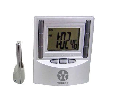 Relógio de mesa digital produzido em plástico, com multifuncionalidade, medidas 9.5x8x2.5. Gravação serigrafia em 1 cor.