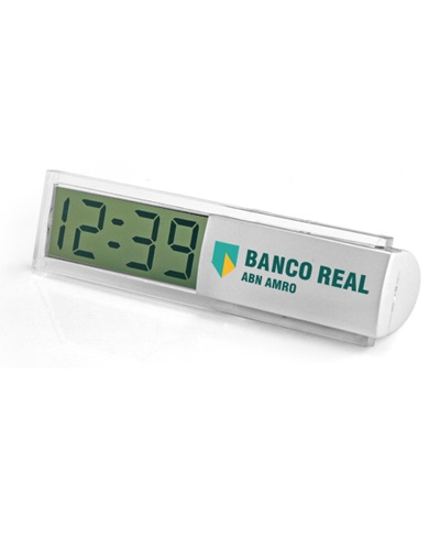 Relógio plástico digital com visor lcd. Ao apertar duas vezes o botão MODE irá configurar o mês (aperte SET para alterar e após MODE para continuar configurando), pressionando novamente irá alterar o ano, na sequência irá alterar a hora(AM/PM) e minutos. Ao apertar SET duas vezes seguida mostrará os segundos. Acompanha uma bateria AG13, medidas 10,6 cm x 3,2 cm. Gravação a laser.