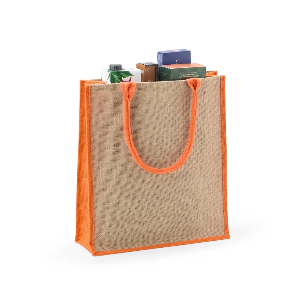 Descrição: Sacola ecológica confeccionada em juta com alças costuradas na parte interna.