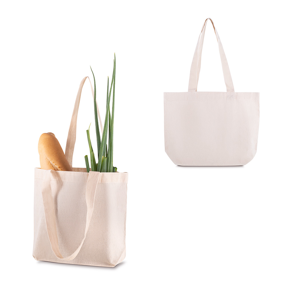 Sacola em Algodão Cru 120g/m²com base plana. Alça com altura de 23 cm, ideal para transporte.