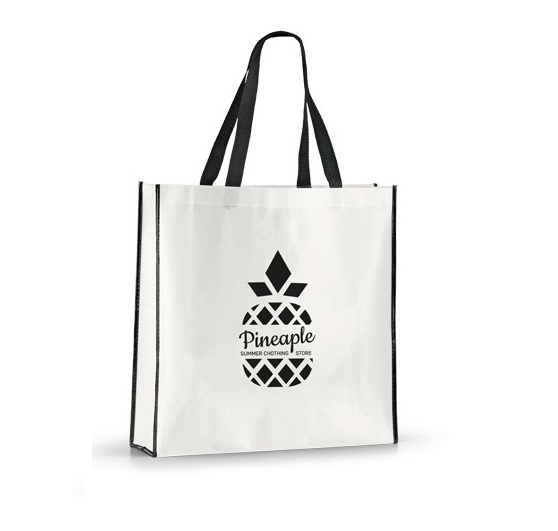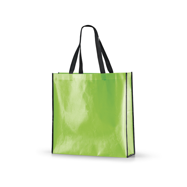 Sacola produzida em TNT laminado gramatura 120 g/m² com laminação brilhante. Alças em webbing de 60 cm comprimento, medidas da sacola 420 x 280 x 150 mm. Gravação serigrafia em 1 cor.