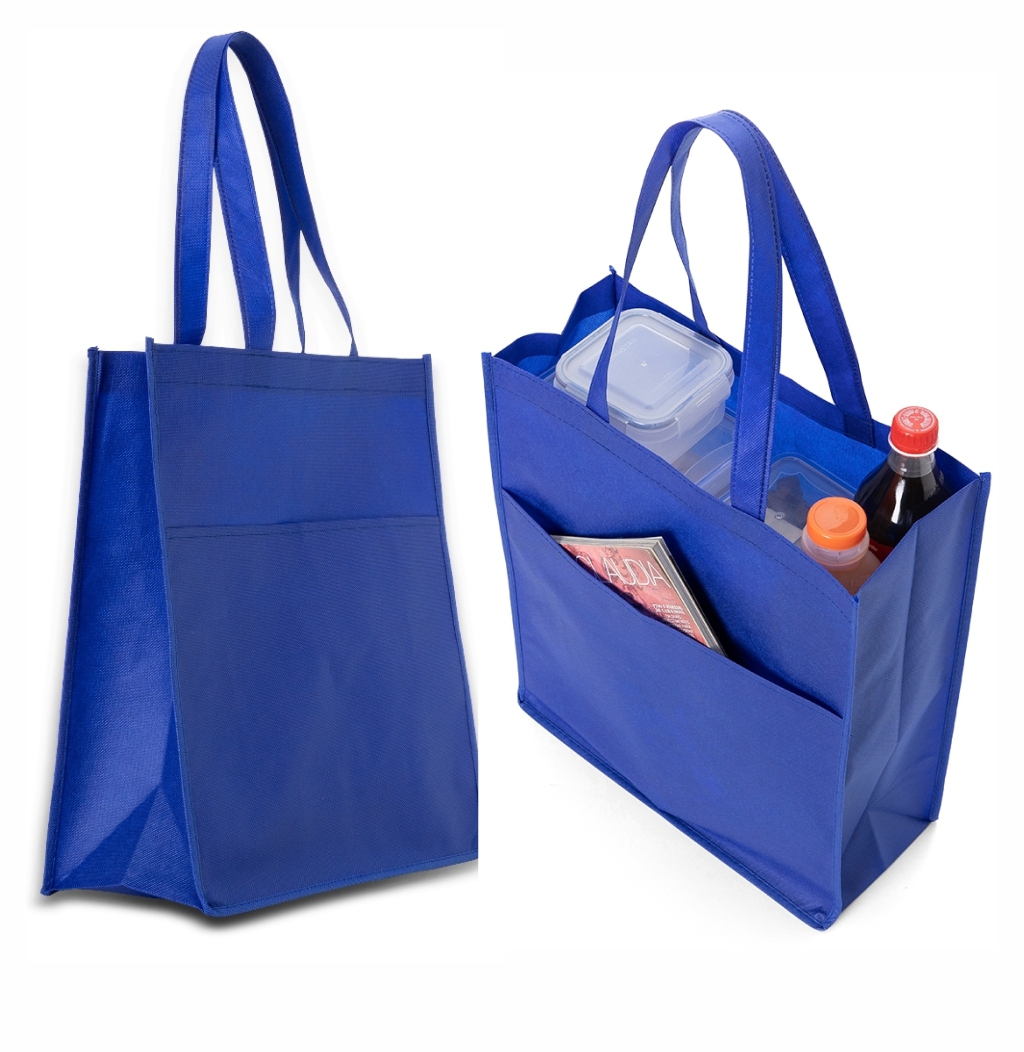 Sacola produzida em TNT com bolso frontal externo e fundo amplo, possui alças de ombro para transporte.