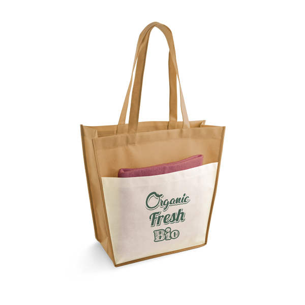 Sacola produzida em TNT Non-woven gramatura 80 g/m² , possui bolso frontal e alças de 60 cm, 400 x 350 x 150 mm. Gravação serigrafia em 1 cor.