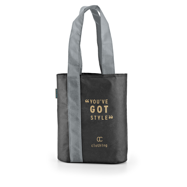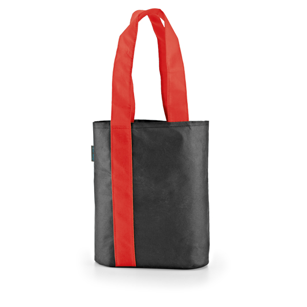 Sacola produzida em TNT 80 g/m², possui alças de 65 cm, e medidas da sacola 370 x 370 x 120 mm. Gravação serigrafia em 1 cor.