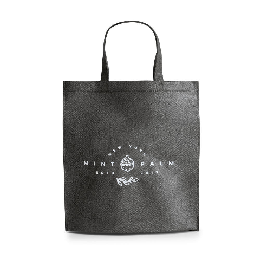 Sacola produzida em TNT non-woven, acabamento para fechamento termo-selado, alças de ombro de 50 cm comprimento, medidas 380 x 415 mm. Gravação serigrafia em 1 cor.