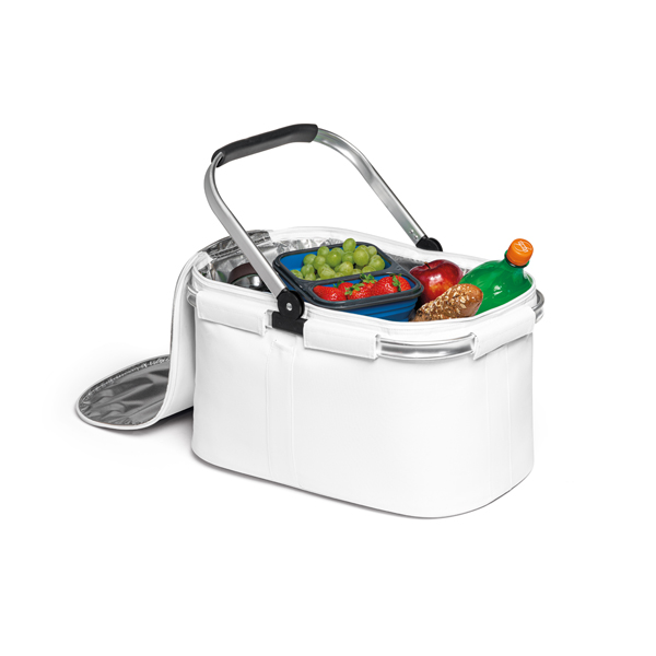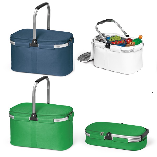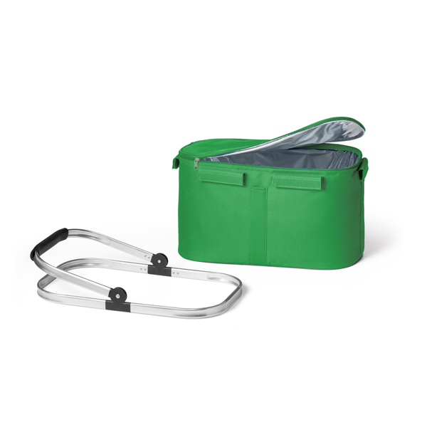 Sacola térmica flexível produzida em poliéster 600D, com zíper duplo e interior forrado. Estrutura removível em alumínio, com pega ergonômica em EVA, capacidade até 14 L, medidas. 460 x 250 x 270 mm. Gravação serigrafia em 1 cor.