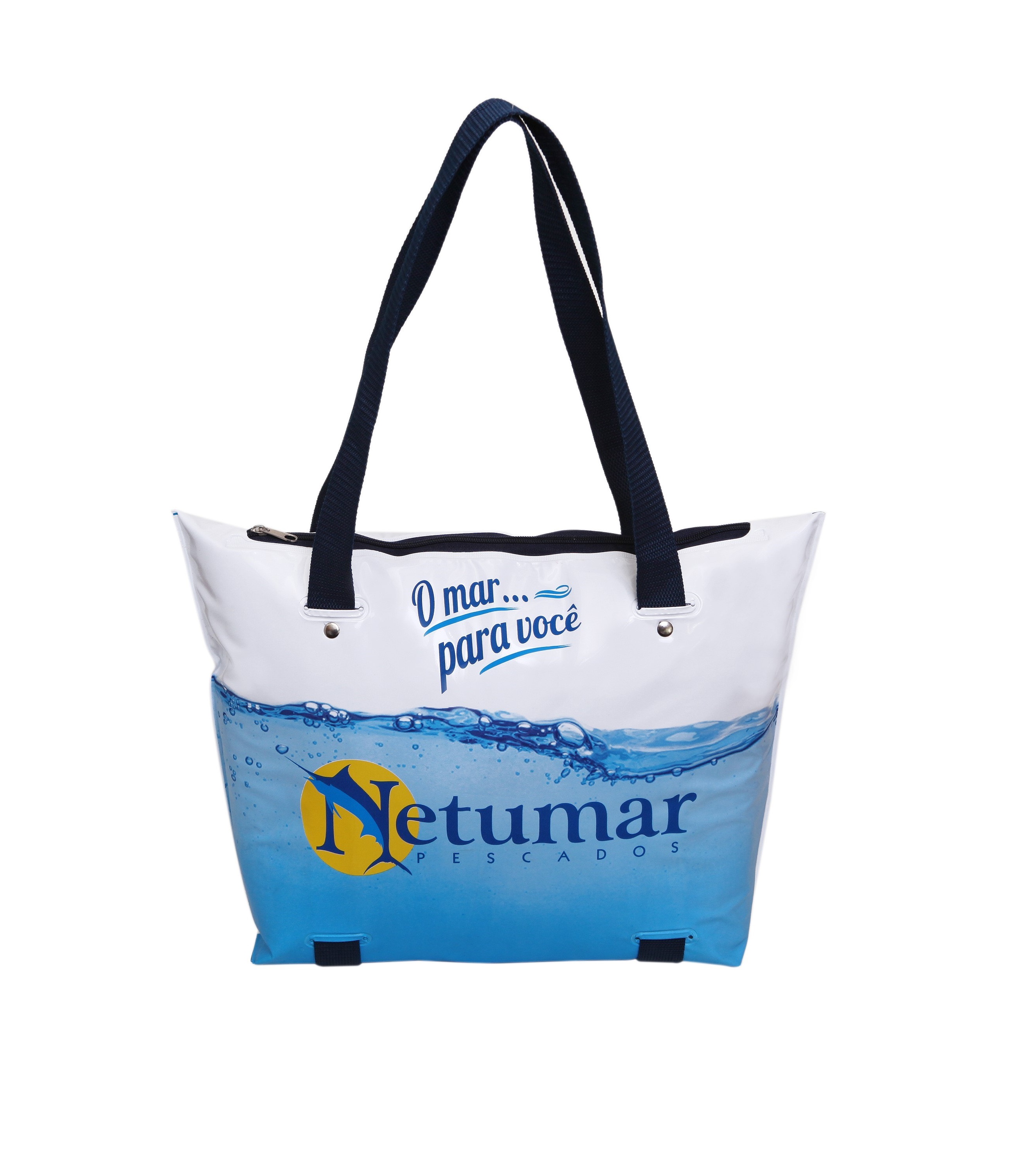 Sacola térmica com alça de ombro, produzida em PVC Brilho 020mm, forro em PVC leitoso 018mm, alça de polipropileno, zíper de nylon, cursor niquelado, rebite niquelado, espuma térmica, medidas 40 x 32 x 10 cm. Gravação serigrafia em 1 cor.