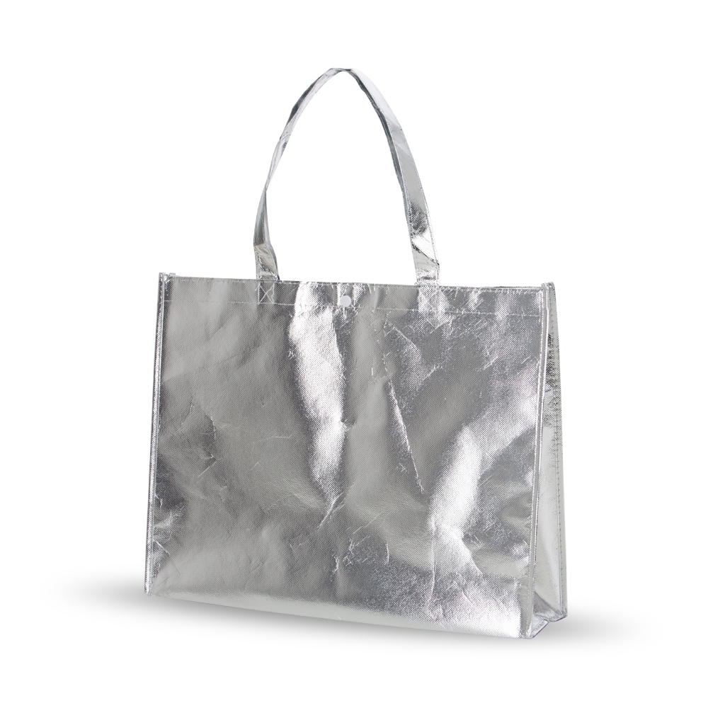 Sacola produzida em TNT metalizada com botão, parte em TNT com revestimento plástico laminado, parte superior possui botão plástico para fecho, medidas 35 x 45,5 x 11,5 cm. Gravação serigrafia em 1 cor.