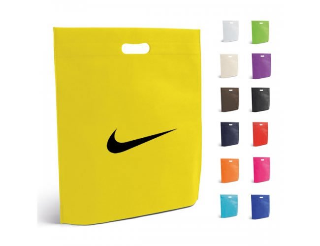 Sacola em TNT com alças de mão modelo sorriso, medidas 40 x 50 cm. Gravação serigrafia em 1 cor