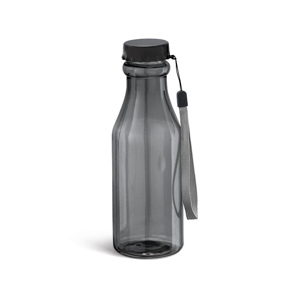 Squeeze produzida em plástico AS com tampa e cordão, capacidade 500 ml, medidas ø 68 x 203 mm. Gravação serigrafia em 1 cor.