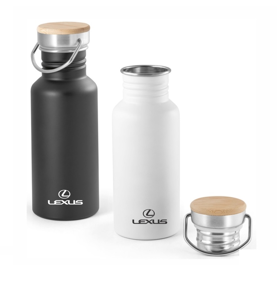 Squeeze em Aço inox com tampa em bambu, capacidade: 540 ml, medidas Ø68 x 192 mm. Gravação a laser.