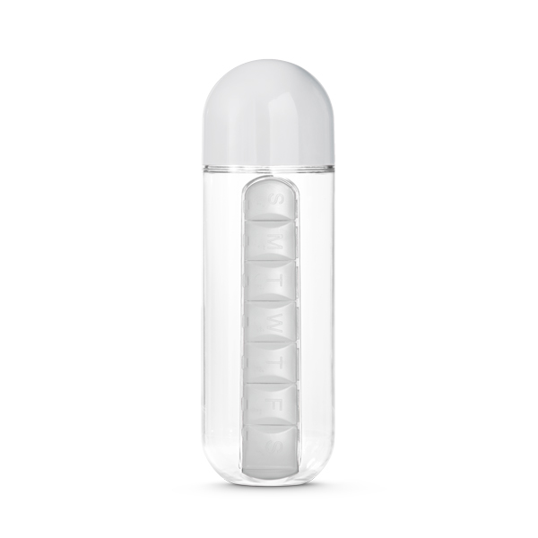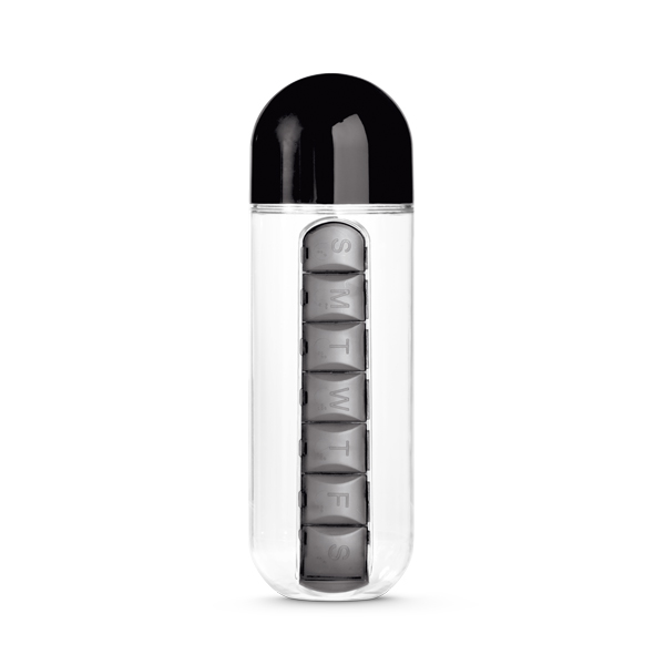 Squeeze plástica com tampa e porta comprimidos em PP com 7 divisórias, capacidade 740 ml e medidas. ø 75 x 240 mm. Gravação serigrafia em 1 cor
