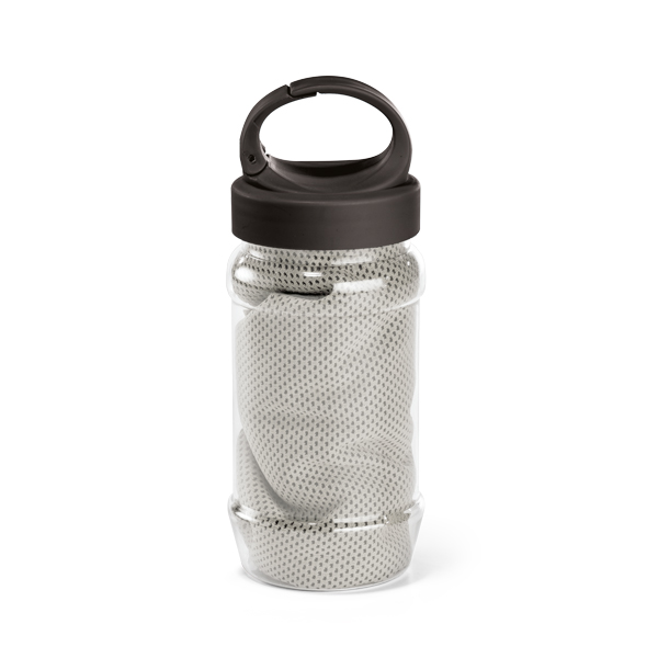 Squeeze plástica produzida em PP e PET com alça mosquetão e Toalha para esporte em poliamida e poliéster. Toalha refrescante, quando molhada permanece fria durante horas. Se aquecer, basta balançar reativando sua frescura. Reutilizável e lavável à máquina. Medidas Toalha: 300 x 800 mm | Medidas Garrafa: ø65 x 125 mm. Gravação serigrafia em 1 cor na toalha e squeeze.