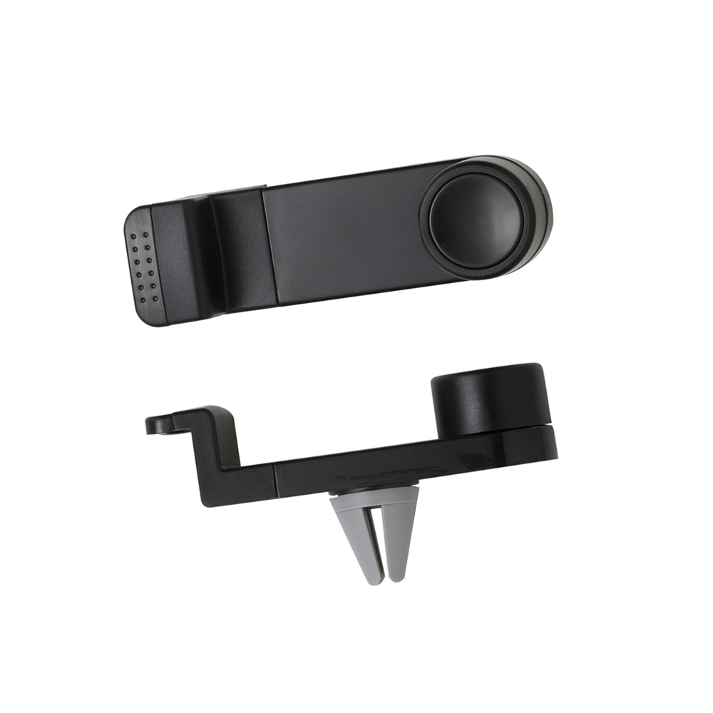 Suporte de celular veicular regulável, material em plástico resistente com detalhes emborrachados para evitar que escorregue o celular. Para utilizar basta encaixar o suporte cinza traseiro no painel de ar do veículo e regular o tamanho desejado puxando pelas laterais. Medidas Altura: 98 mm x Largura: 29mm, Gravação serigrafia em 1 cor.