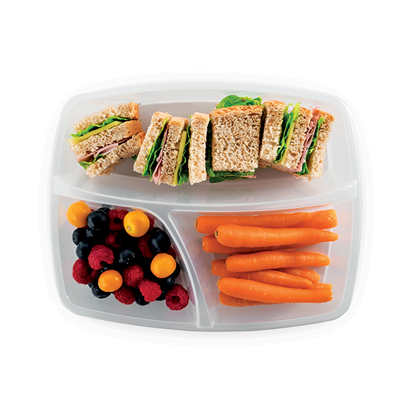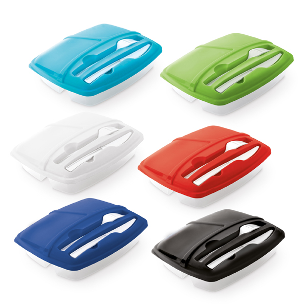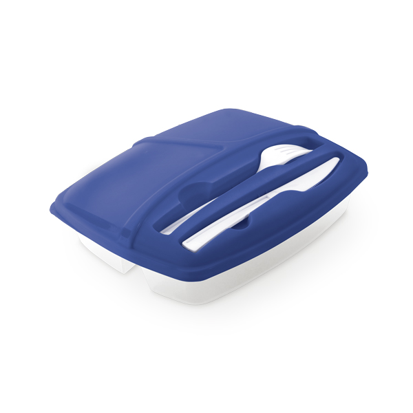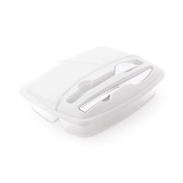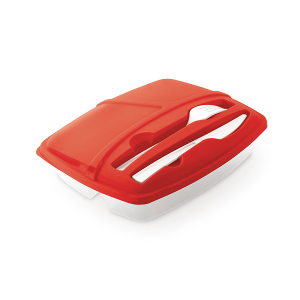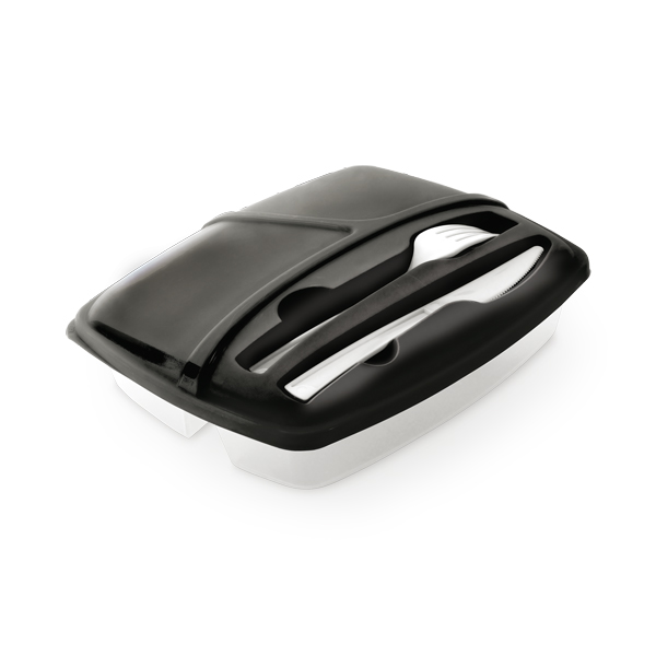 Vasilhame para mantimentos/ marmita/refeição produzido em plástico PP, possui 3 compartimentos, garfo e faca. Capacidades: 250 ml, 270 ml e 470 ml. Apta para microondas (retirar a tampa), medidas 235 x 195 x 60 mm. Gravação serigrafia em 1 cor.